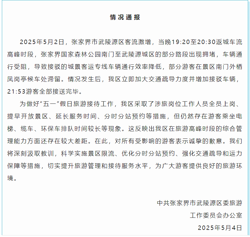 2025年5月2日,张家界市武陵源区客流激增,当晚19:20至20:30返城车流高峰时段,张家界国家森林公园南门至武陵源城区的部分路段出现拥堵,车辆通行受阻,导致接驳的城景客运专线车辆通行效率降低,部分游客在景区南门外栖凤岗亭候车处滞留。情况发生后,我区立即加大交通疏导力度并增加接驳车辆,21:53游客全部接送完毕。